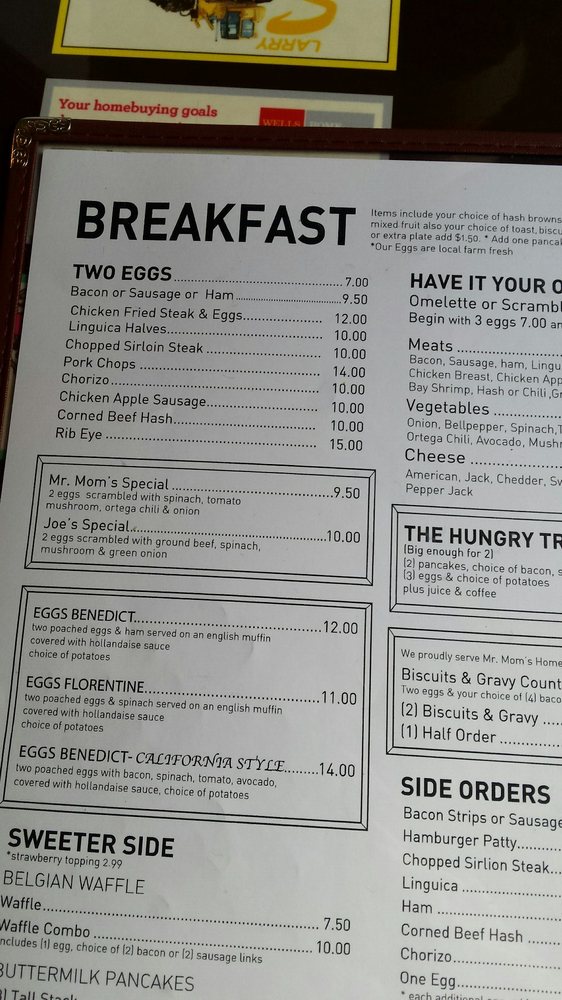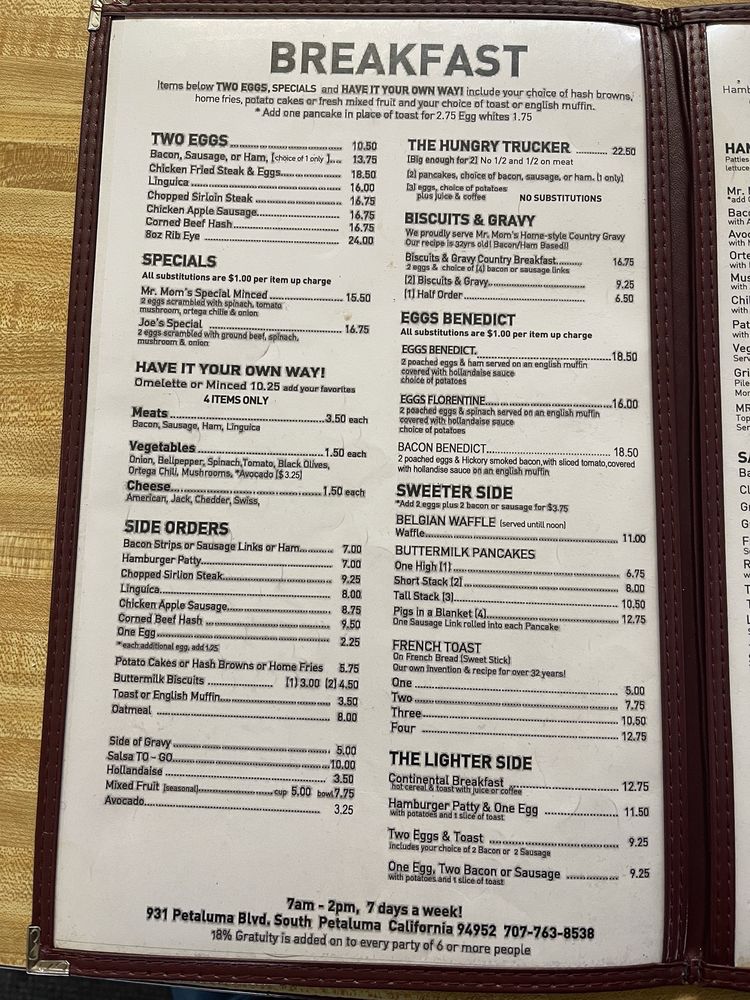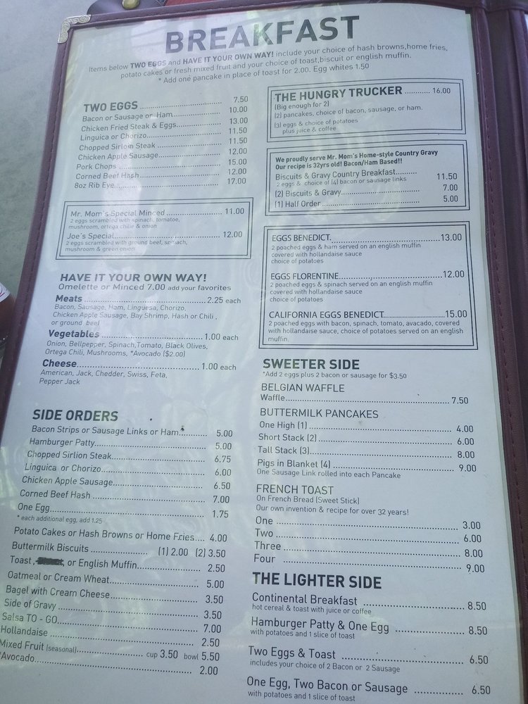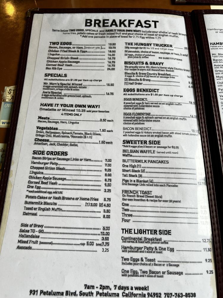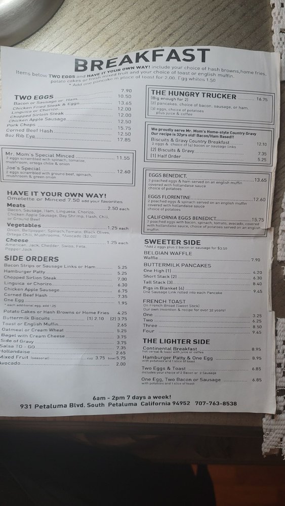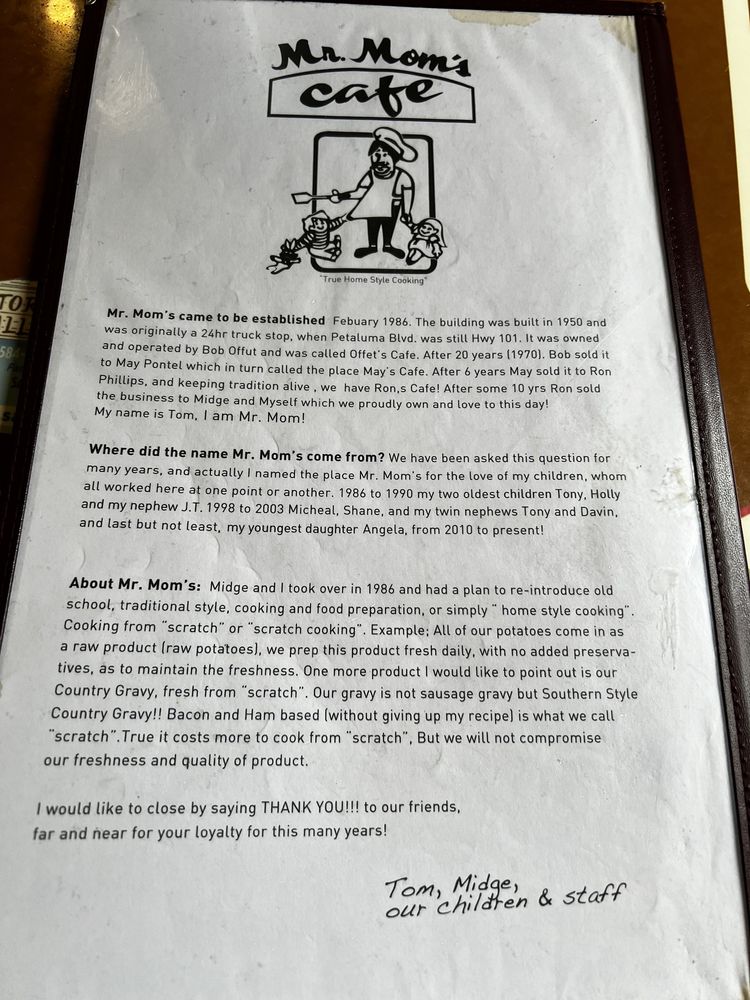 Introducing the menu at Mr. Mom's Cafe, a classic diner in Petaluma, CA offering hearty breakfast and brunch options. With a cozy decor and friendly staff, this family-owned spot has been a local favorite for over 4 decades. Customers rave about the homemade dishes like biscuits and gravy, Florentine Benedict, and the Hungry Trucker breakfast. The menu features many vegetarian options and all items are made in-house, ensuring quality and freshness. The atmosphere is casual and welcoming, perfect for families and groups. Whether you prefer sweet or savory, Mr. Mom's Cafe has something for everyone, from fluffy pancakes to rich hollandaise sauce. Don't miss out on the homey vibes and generous portions at this beloved diner.